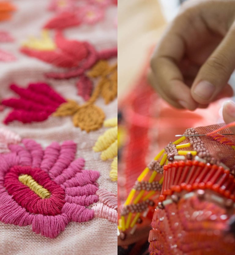 A wide array of hand, machine and cord embroidery, along with beading styles are developed at Madurana Atelier encompassing regional and international inspirations.